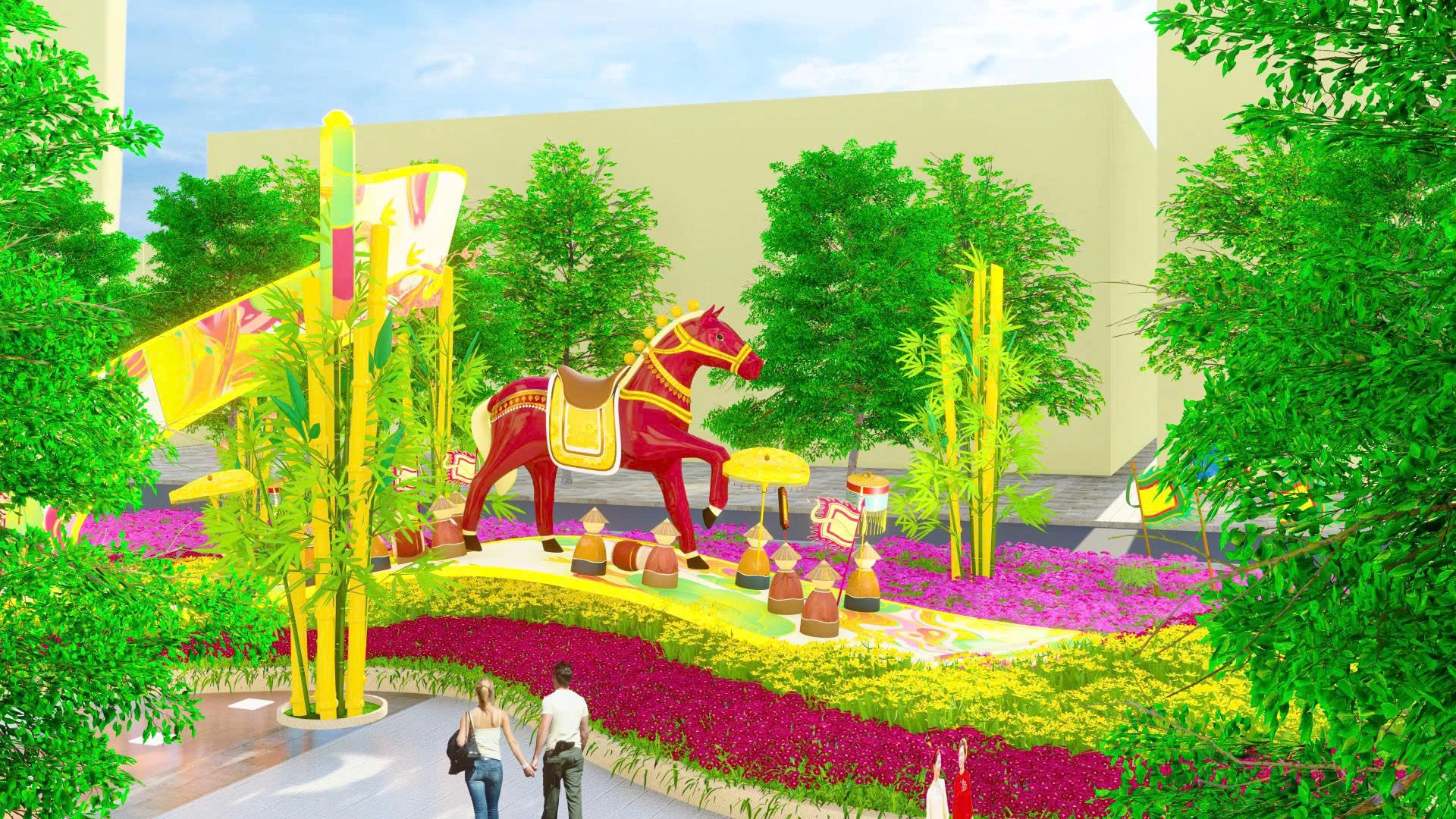 Some groups of horses are depicted in standing, running, or turning poses, with heights varying from 1.45 m to approximately 3.6 m in models with an upward-reaching posture. The use of various sizes of miniature mascots helps to make the Flower Street space more vibrant, rhythmic, and avoids repetition, while creating a smooth transition between the large and small scenes along the entire route.